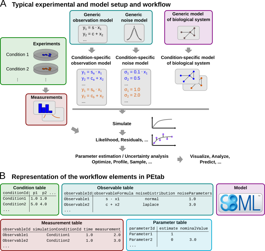 The scope of PEtab is the full specification of parameter estimation problems in typical systems biology applications. In our experience, a typical setup of data-based modeling starts either with (i) the model of a biological system that is to be calibrated, or with (ii) experimental data that are to be integrated and analyzed using a computational model. Measurements are linked to the biological model by an observation and noise model. Often, measurements are taken after some perturbations have been applied, which are modeled as derivations from a generic model (Figure 1A). Therefore, one goal was to specify such a setup in the least redundant way. Furthermore, we wanted to establish an intuitive, modular, machine- and human-readable and -writable format that makes use of existing standards.